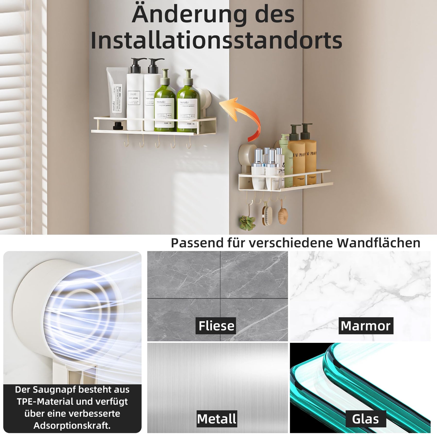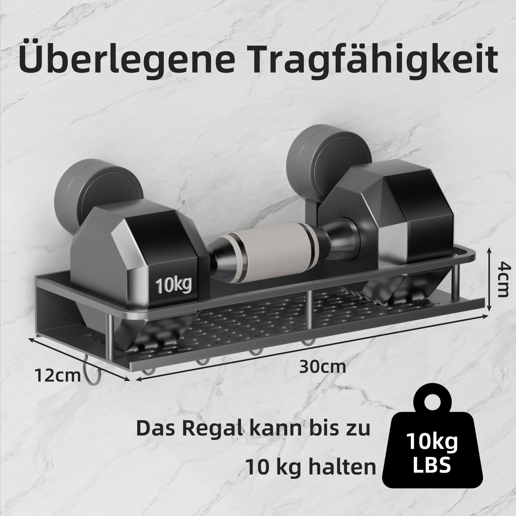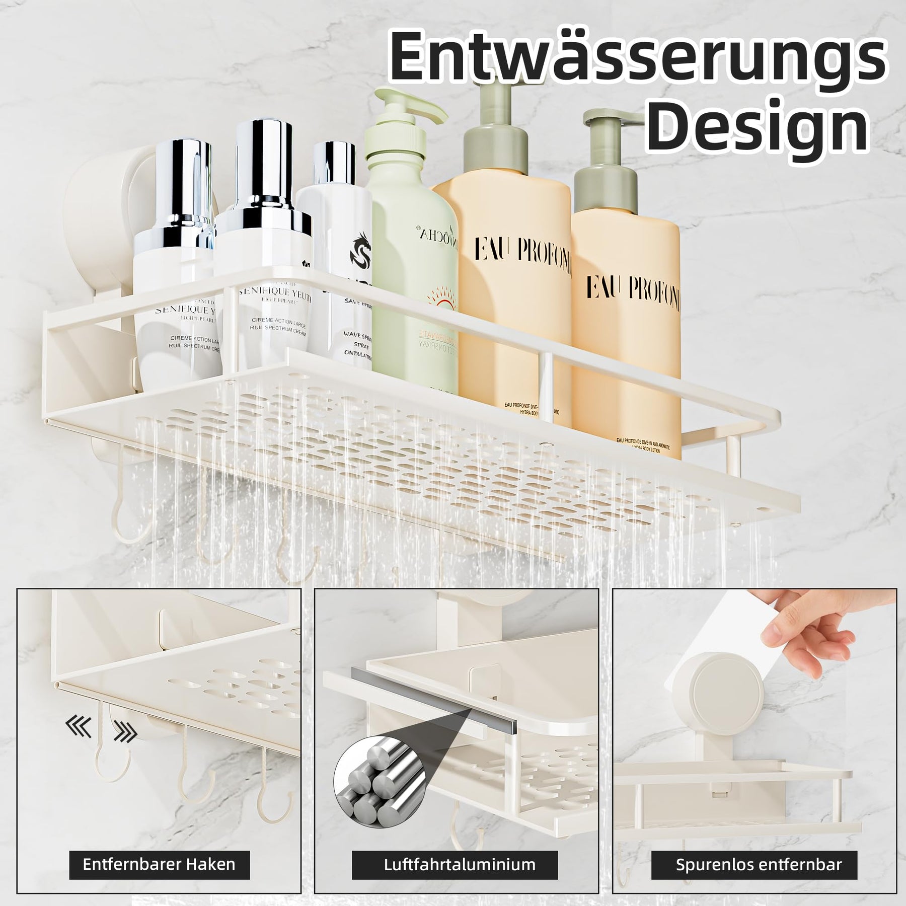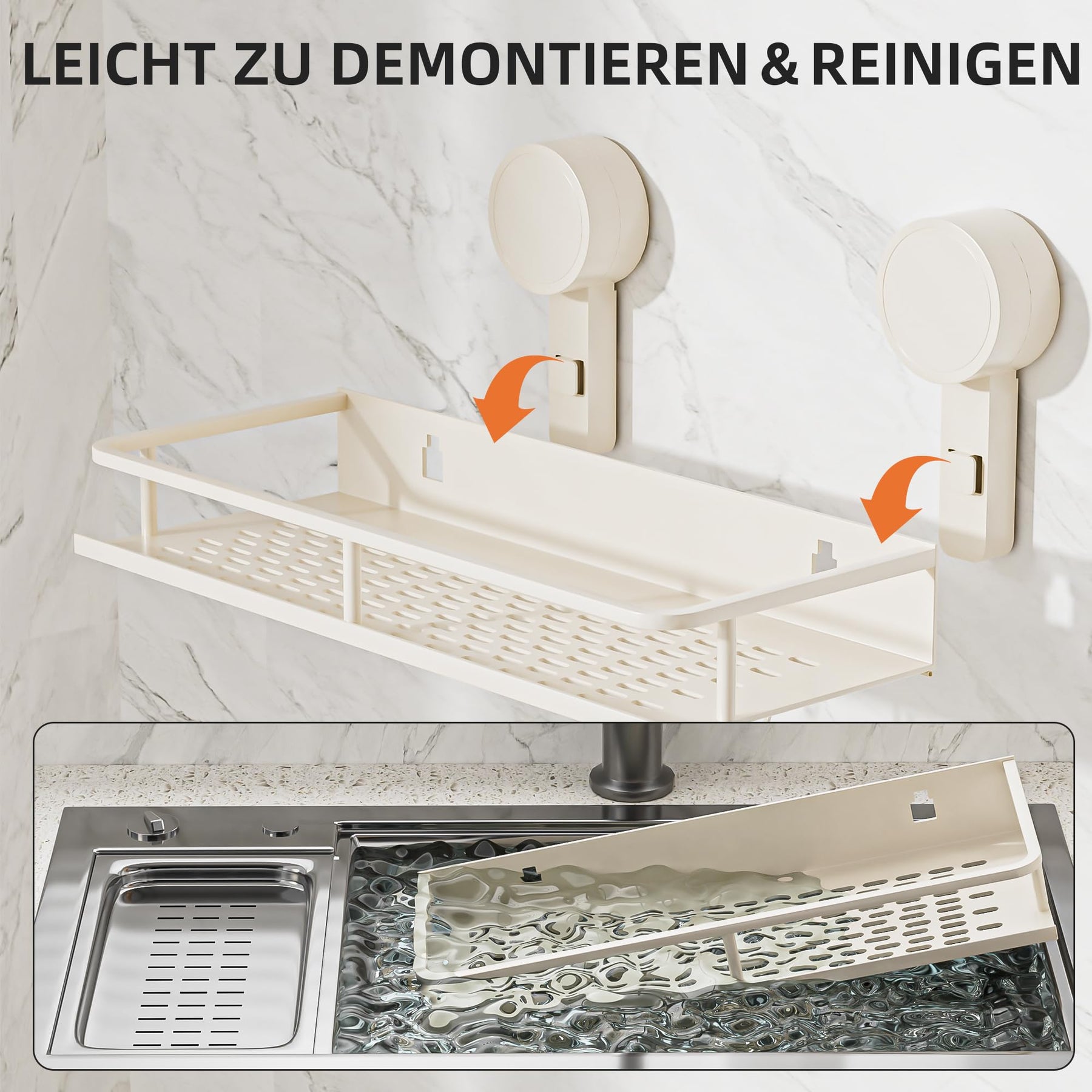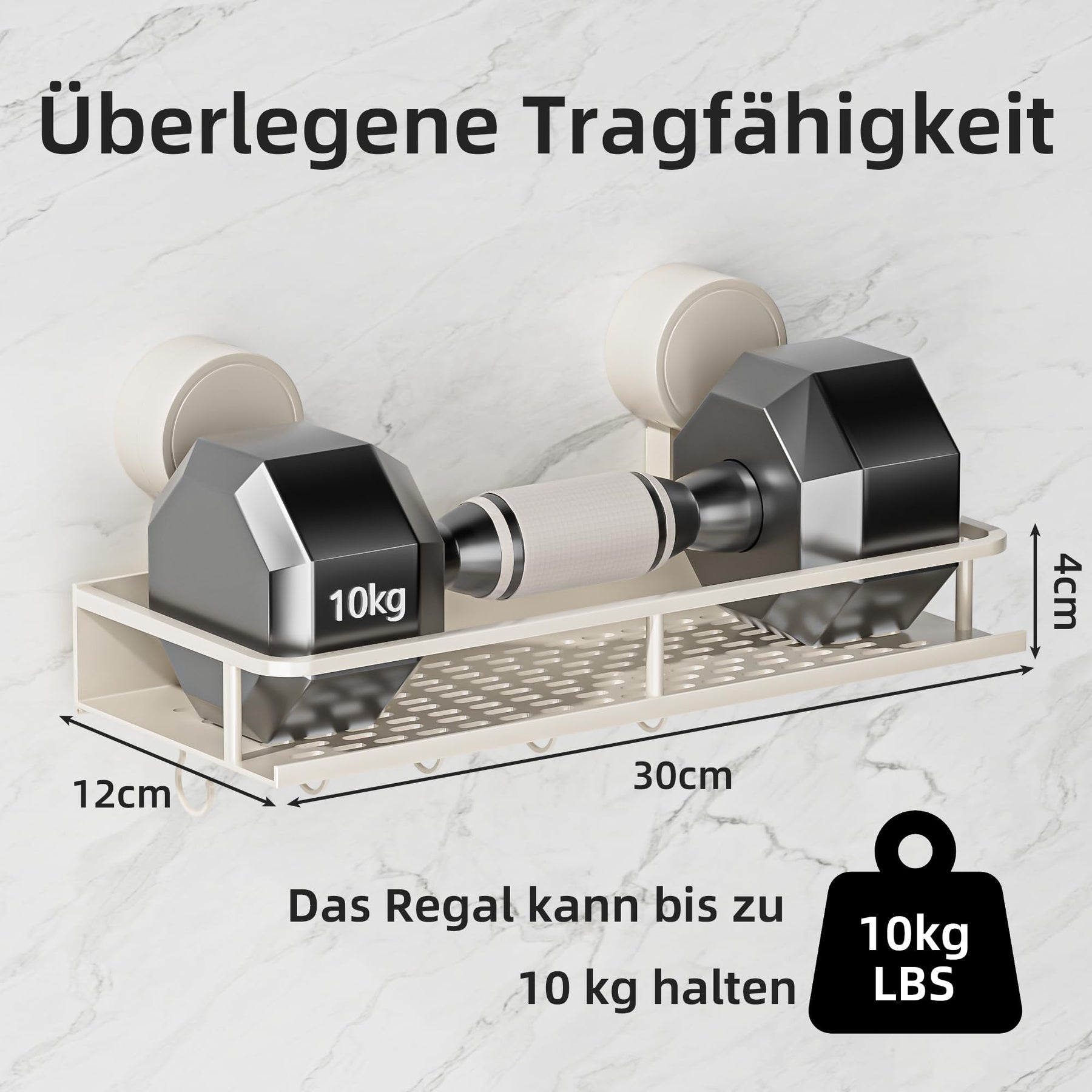 Suction Cup No Drilling Shower Shelf, 10 kg Load Capacity Bathroom Shelf for Shampoo Conditioner, Removable and Rustproof Bathroom Organiser with Large Capacity, White